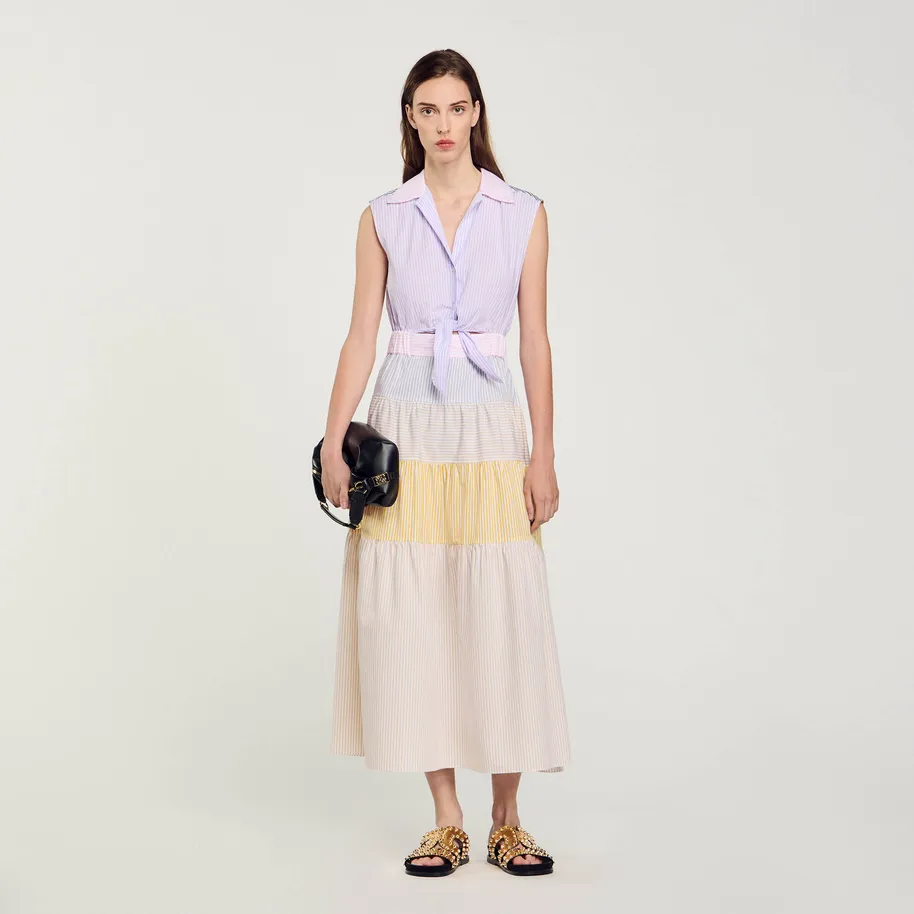 Đầm maxi kiểu áo sơ mi nổi bật với phần áo không tay có nút và nút cài như một chiếc áo sơ mi, chân váy xòe với các chi tiết diềm xếp nếp và cạp váy co giãn đính nơ.