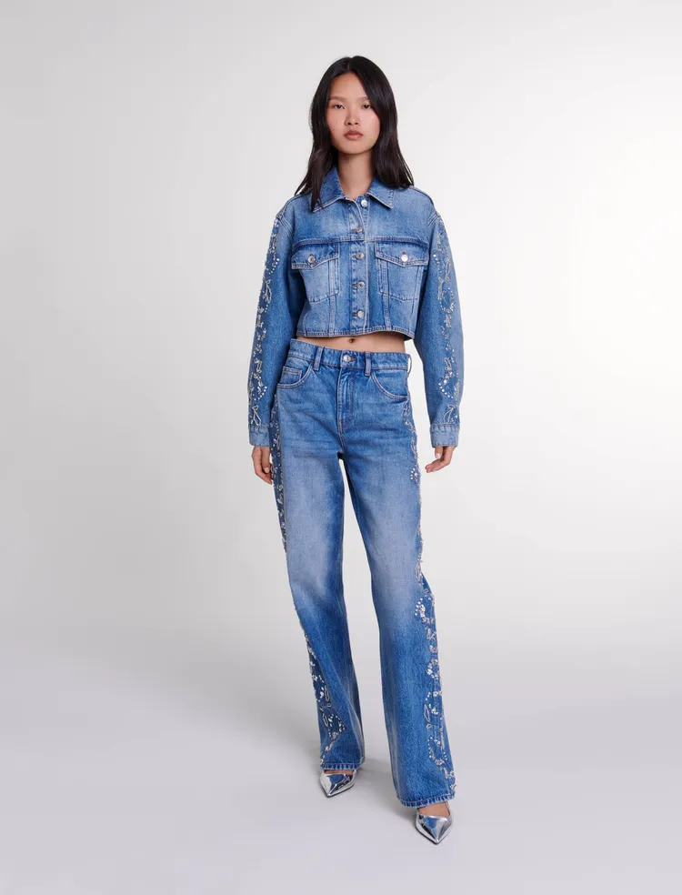 Quần jean suông rộng denim màu đen mài