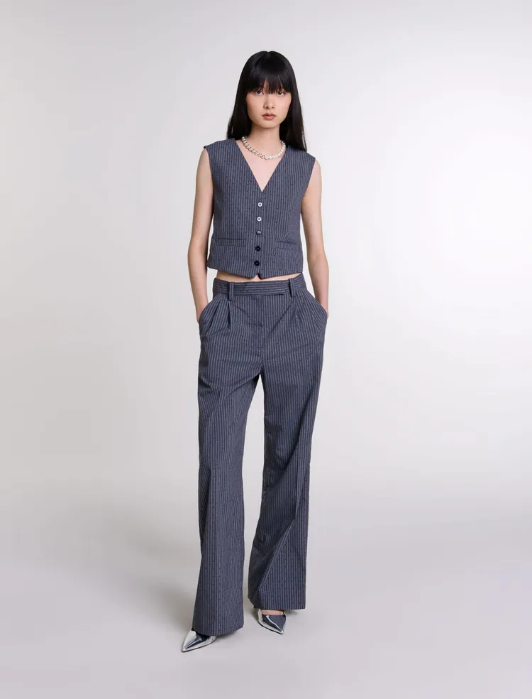 Quần tây ống rộng dáng suông với hai túi, mang đến vẻ ngoài thanh lịch và cá tính. Những đường kẻ mảnh được nhấn nhá bằng họa tiết đính đá, tạo điểm nhấn lấp lánh và cá tính cho trang phục của bạn.