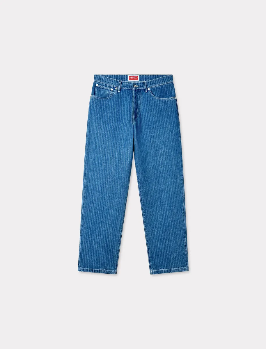 Quần jeans ống rộng BOTAN. Màu xanh nhạt chàm sọc. Nhãn KENZO Paris trên túi sau. Đường may nổi hình núi Phú Sĩ trên túi sau. Nút cài denim Nhật Bản Kuroki. Hai túi bên hông. Một túi nhỏ. Hai túi sau.Reference: FE65DP4106F4
