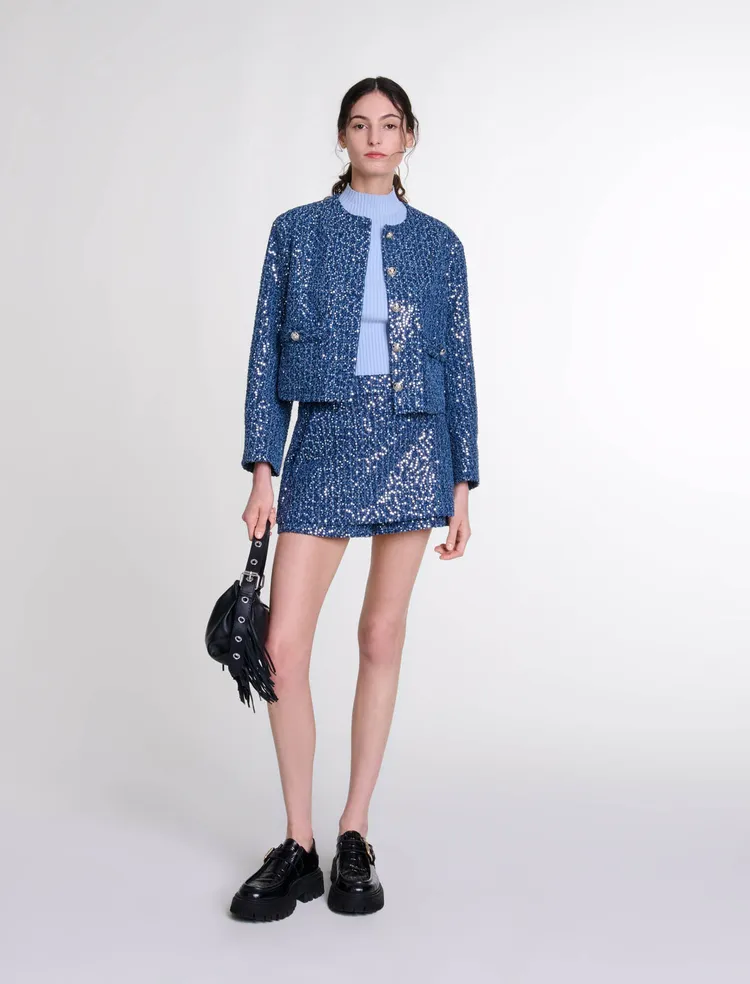 Thỏa sức nổi bật với chiếc quần skort được tô điểm bằng sequin lấp lánh toàn bộ. Quần được làm từ chất liệu denim hiệu ứng tweed, có hai túi và cạp lưng thun co giãn phía sau, tôn dáng một cách thanh lịch.