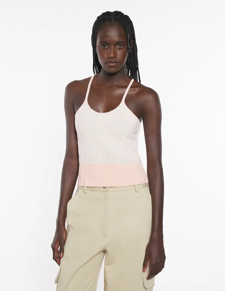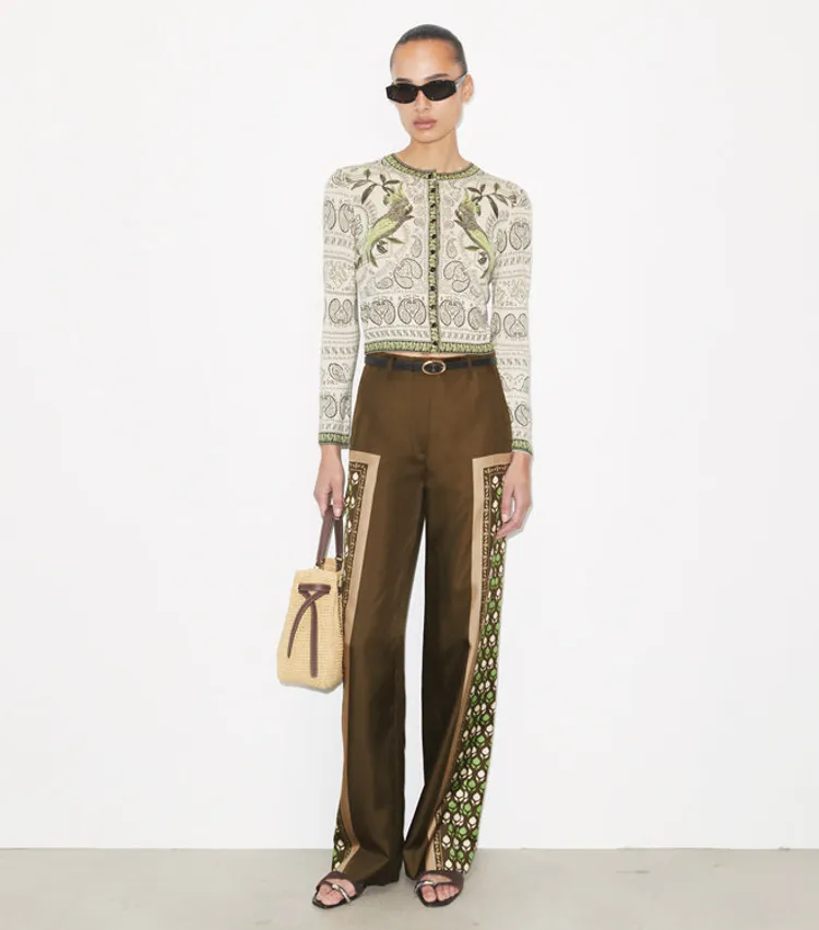 Đầm maxi họa tiết vằn từ Sandro tạo nên một điểm nhấn thị giác thú vị nhưng không quá ồn ào. Để hoàn thiện vẻ ngoài, đôi dép bệt Eleanor cùng túi xách mini bằng satin từ Tory Burch mang lại sự tinh tế, hòa hợp với bối cảnh xanh mát của resort. Những món đồ này không quá phô trương mà vẫn toát lên gu thẩm mỹ sắc sảo của người sở hữu, khẳng định phong cách qua từng chi tiết thủ công tỉ mỉ.