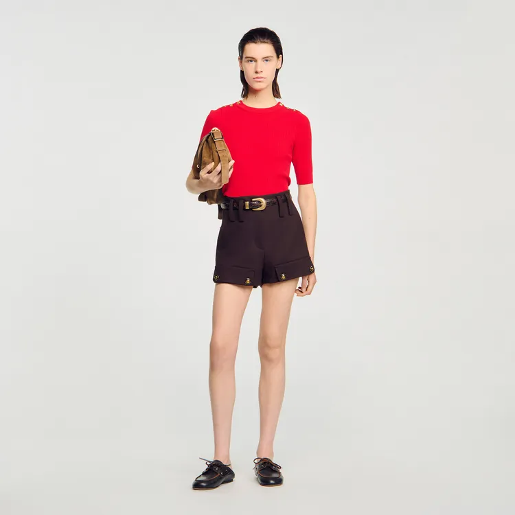 Lấy cảm hứng từ quý cô Paris thập niên 60 – nơi nữ tính hòa quyện cùng kỷ luật phom dáng – tổng thể này là cuộc đối thoại tinh tế giữa cổ điển và hiện đại. Cardigan Tory Burch với đường viền tương phản mang cấu trúc chỉn chu, trong khi crop-top đính đá từ SANDRO tạo điểm nhấn bắt sáng, phá vỡ sự an toàn của set đồ kinh điển.