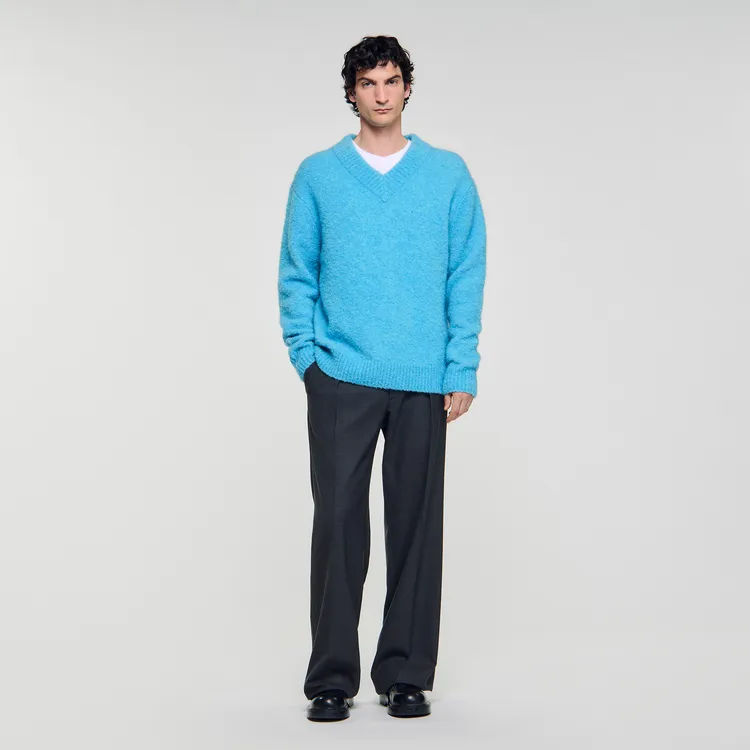 Áo len SANDRO sắc turquoise với phom relaxed mang đến cảm giác êm dịu, gợi vẻ nữ tính tự nhiên nhưng không rập khuôn. Khi kết hợp cùng chân váy da mocha và phụ kiện tối giản, tổng thể trở thành cuộc đối thoại giữa mềm mại và cấu trúc, sắc sáng và trầm.