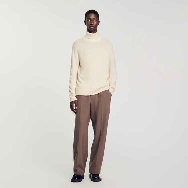 Chàng stylist chọn mix mẫu áo cổ lọ phối khóa kéo với áo khoác quá cỡ từ HUGO. Chi tiết trang trí hình bông hoa cài bằng len tạo điểm nhấn trên ve áo - sắc đỏ tinh tế tiệp tông với logo thương hiệu được cắt xẻ sáng tạo và đáp trên tay áo